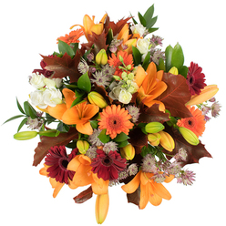 As a dedicated florist in Whetstone, I am continually enchanted by how colour, fragrance, and thoughtful curation come together to speak the language of the heart. Here, a radiant arrangement of roses-each bloom unfurling in a dance of rich coral, soft peach, and touches of salmon-glows invitingly, their velvety petals gently illuminated, as if basking in spring sunlight filtering over Lynton Way. Many blossoms showcase a delicate bicolor pattern, beginning with creamy yellow centers that fade into deeper, fiery hues at the edges, evoking the changing shades seen in local N20 gardens as summer approaches. Nestled among the florals, dark glossy leaves like those of fresh eucalyptus frame the composition elegantly, amplifying the vibrancy of the flowers without overpowering their warmth. The bouquet's tactile allure-soft petals, flexible stems, lush greenery-creates a visual and sensory symphony, exuding warmth, promise, and celebration. Accentuating this feast for the senses, a Thorntons Orange Crisp pouch rests nearby, its inviting label and depiction of tempting chocolates suggesting indulgence and luxury. Two shining truffles, placed just in front, call to mind cozy afternoons enjoyed by locals at Whetstone cafes, their milk chocolate shine hinting at the delightful zest within. This ensemble makes a heartfelt local gift, ideal for celebrating birthdays, anniversaries, or simply brightening a loved one's day along Totteridge Lane. Crafted by expert hands at Flowers Whetstone, the combination brings together artistry and emotion, capturing the tender spirit so cherished in our community.
