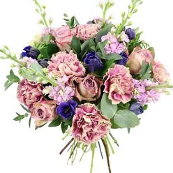 This vibrant Whetstone bouquet unfolds a symphony of harmonious colours and sumptuous textures, thoughtfully arranged by local floral artisans. Dominant, cloud-like clusters of hydrangeas in intricate shades of indigo, slate blue, and moody teal set the stage, recalling the tranquil beauty of local parks and meadows. Interspersed between these voluminous blooms are soft lavender roses, each petal curling open with graceful serenity, and classic white roses that provide an ethereal radiance. Creamy white ranunculus, densely layered and plush, nestle among the larger blossoms, while stems of pale yellow eustoma, both in tight bud and gentle bloom, add luminous vertical lines that mirror Whetstone's fresh spring landscapes. Cheerful sprays of fuchsia-pink blossoms enliven the bouquet, balanced by gossamer plumes of pastel pink astilbe at the perimeter, which introduce an airy, whimsical note. The inclusion of fine, almost translucent light-green filler flowers adds intricate depth and freshness, reminiscent of countryside hedgerows after early morning walks in Whetstone. Glossy dark green foliage supplies the final lush contrast, allowing the florals' cool tones to shine. All stems are expertly tied together with a deep purple satin ribbon-rich and lustrous, it gathers the bouquet with care and finesse. This truly abundant arrangement, available for delivery across Whetstone, exudes joy and tranquillity; perfect for elevating special occasions or simply brightening someone's day with the artistry and warmth only a local florist can provide.