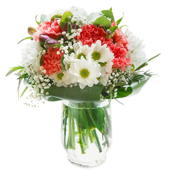 This joyful bouquet, carefully crafted in the heart of Whetstone, bursts with color and the very essence of thoughtful floristry. Coral and peach carnations, their petals softly ruffled like a gentle summer breeze through Swan Lane Open Space, are woven together with pure white daisies whose cheerful green and yellow centers gleam like early morning sunlight. Floating freely among the main blooms, the airy, cloud-like clusters of baby's breath suggest innocence and hope, while unopened buds tinged with purple offer a quiet promise of blooms yet to come. Deep, glossy green leaves gather beneath, forming a lush, embracing base and completing the sense of abundance. Presented upright in a sleek white gift bag with strong ribbon handles, this arrangement radiates uplifting energy-ideal for celebrating a birthday or simply bringing light to a loved one's day in Whetstone. The crisp white backdrop lets each blossom shine, elevating the bouquet's sense of freshness and artistry. Every careful placement of flower and leaf reflects the care and community spirit that defines local floral design, making this bouquet a fitting tribute to new beginnings or thoughtful surprises delivered across the Whetstone area. This bouquet exudes the joy of an early spring morning in Whetstone, its handpicked coral-pink carnations and cheerful white daisies arranged in a round, harmonious composition. The velvety carnation blooms cradle crisp daisy petals, each center glimmering a fresh green, like dew on the grass of Friary Park. Feathery gypsophila drifts between the blossoms, bringing lightness and movement, while delicate alstroemeria buds add hints of blush and purple, signifying the promise of blossoms yet to unfurl. Eucalyptus sprigs, with their soft silvery-green hue, nestle among deeper foliage, framing the display and offering a whisper of woodland fragrance familiar to the parks and gardens nearby. This lush, vibrant bouquet is more than a collection of flowers-it's a celebration, perfect for birthdays, anniversaries, or brightening any Whetstone home. Each stem is thoughtfully placed for beauty, longevity, and meaning, ready for same-day delivery by local florists with a passion for bringing happiness to the community. Radiating warmth and gentle sophistication, this striking bouquet arranged by Whetstone florists captures the essence of a perfect spring day. Fluffy coral-pink carnations take centre stage, their densely ruffled petals alive with movement and softness, evoking the cheerful spirit found strolling down the leafy lanes around Whetstone. Brighter white chrysanthemums and classic daisies with their vivid green-yellow eyes unfold all around, infusing the arrangement with a sense of purity and optimism-much like the feeling of sunlight streaming through High Road shop windows. Wispy trails of delicate baby's breath soften the bouquet's contours, weaving a cloudlike delicacy that invites admiration. Along one side, several magenta alstroemeria buds remain gently closed, suggesting new beginnings and adding subtle depth. Glossy, verdant leaves cradle the blooms in a broad, tactile base, while slender greenery winds upward, enhancing the bouquet's naturally fresh appeal. The pristine glass vase, filled with clear water, proudly displays the green stems, reinforcing the handpicked, seasonal quality and the promise of longevity in every local delivery. Presented against a pure, shadowless backdrop, every intricate flower and leaf is highlighted to perfection-making this bouquet an inviting choice to celebrate birthdays, say thank you, or bring brightness to homes across Whetstone.